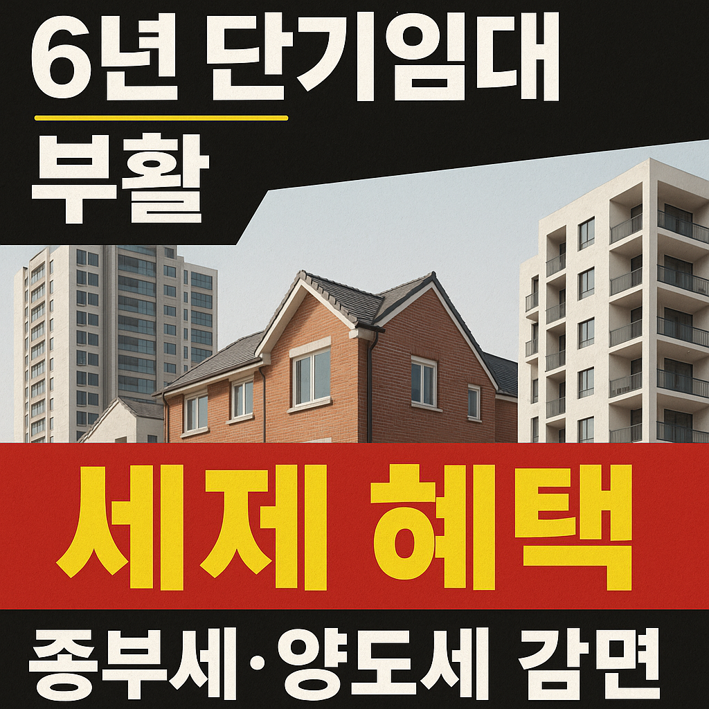 2020년에 폐지되었던 단기임대주택 제도가 6년 의무임대 조건으로 다시 시행됩니다. 아파트는 제외되며, 주로 빌라·연립·오피스텔이 대상입니다. 수도권은 4억 원 이하, 비수도권은 2억 원 이하, 건설형은 공시가 6억 원 이하의 주택에 세제 혜택이 적용됩니다.