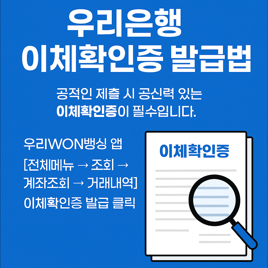 우리은행 이체확인증은 지점 방문 없이도 온라인에서 손쉽게 발급받을 수 있습니다. 우리WON뱅킹 앱을 실행한 후 [전체메뉴 → 조회 → 계좌조회 → 거래내역] 메뉴로 이동하여 원하는 이체 건을 선택하고 '이체확인증 발급' 버튼을 누르면 즉시 PDF로 저장할 수 있습니다.